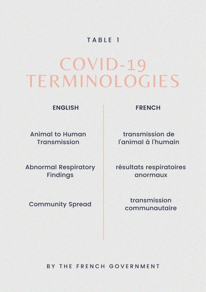Thankfully, with the help of professional translation services, it was possible to translate new terminologies related to the disease into multiple regional languages and break down the problem into simpler steps. The table below will give you an idea of just how easy it was made by the French government, with the help of language services, to navigate these terms.