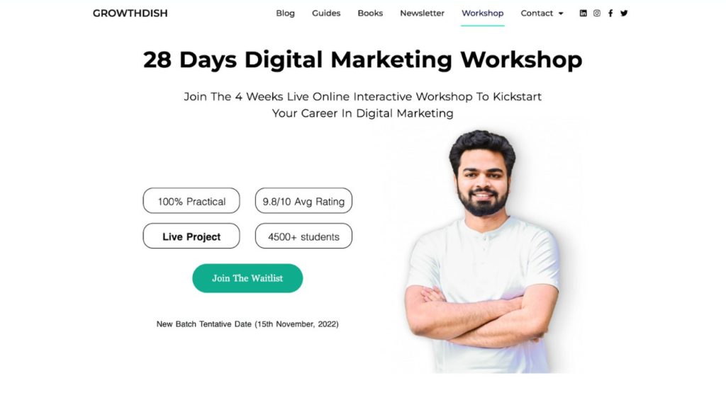 The 28 Days Digital Marketing Workshop by Surojit Mahanto is a great way to learn digital marketing through a four-week live, virtual and highly interactive workshop. Surojit blogs on Growthdish and has also written books and guides on digital marketing.