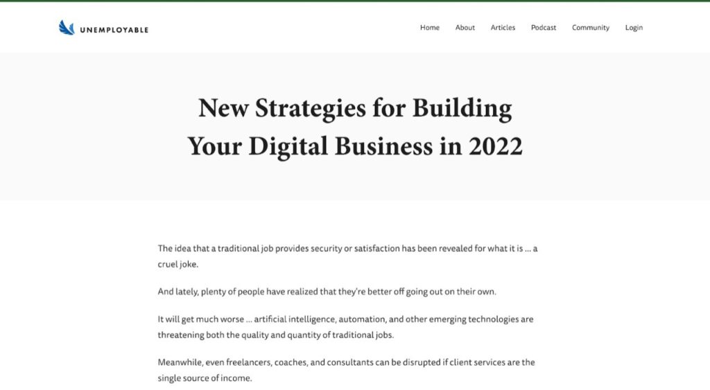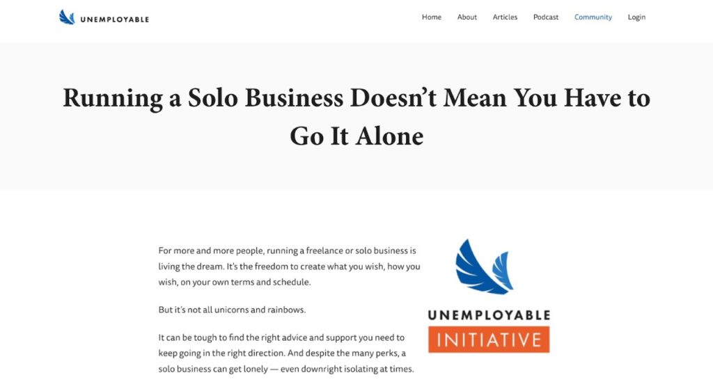 Unemployable by Brian Clark and Jerod Morris is a community and website for entrepreneurs and self-employed professionals. It includes creators, coaches, and consultants who can avail of training and build relationships with business owners in the digital space. You can become a member, avail a free email course, and sign up for their newsletter. You can then access the latest podcast episodes, original articles and other resources.