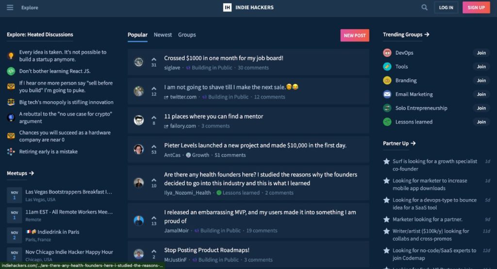 Founded by Courtland Allen, a software engineer, and marketer, Indie Hackers is a community of marketers, founders, creators, and more. You can join it for free and interact with professionals via question boards and meetups. You can also join trending groups based on your interests such as branding, email marketing, DevOps, etc. Explore heated discussions, success stories, and community engagement – all in one place.