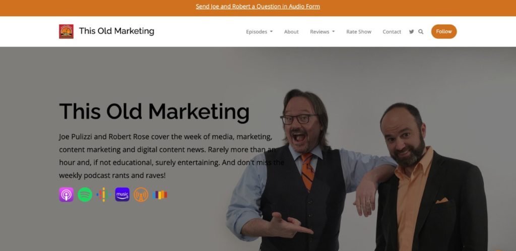 This Old Marketing is the Content Marketing Insititute’s podcast. It is hosted by Joe Pulizzi and Robert Rose. It includes the hosts’ opinions on the latest trends and news in content marketing.