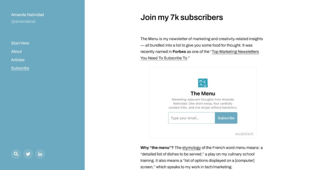 The Menu by Amanda Natividad offers her personal insights about marketing and content creation. Forbes has also named it one of the top marketing newsletters to subscribe to.