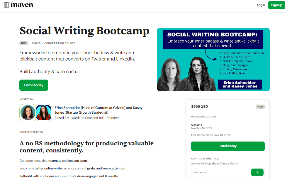 Want to learn how to write content that converts? With this course, you can. Social Writing Bootcamp is a cohort-based course spanning across a period of 6 days. In this course, you will learn how to write engaging content, build an idea engine, generate scroll-stopping hooks, and more. You can enrol for the course for $599.