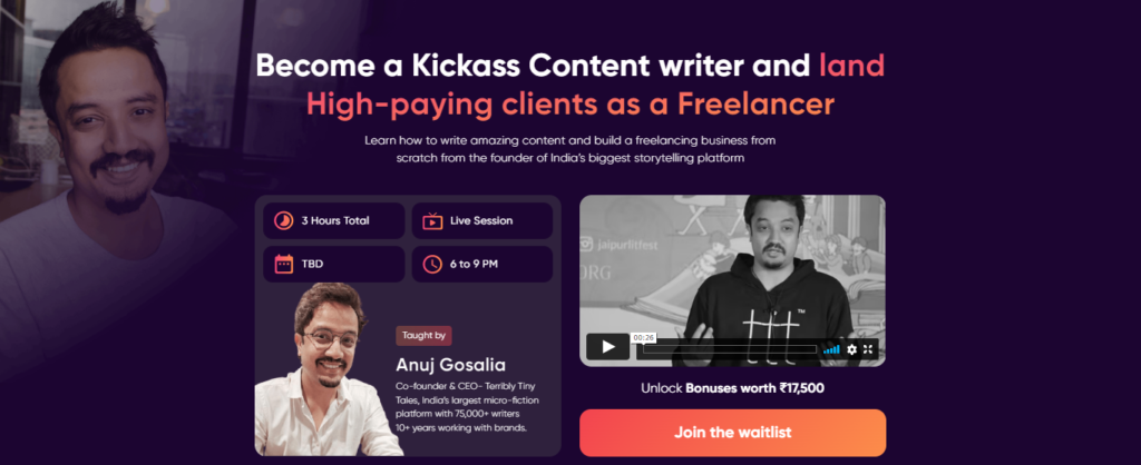 Growth School’s content writing workshop for freelancers is taught by Anuj Gosalia, Co-founder and CEO of Terribly Tiny Tales. Theworkshop helps content writers and freelancers thrive in the industry by building amazing content, landing high-paying clients, building networks, and more.