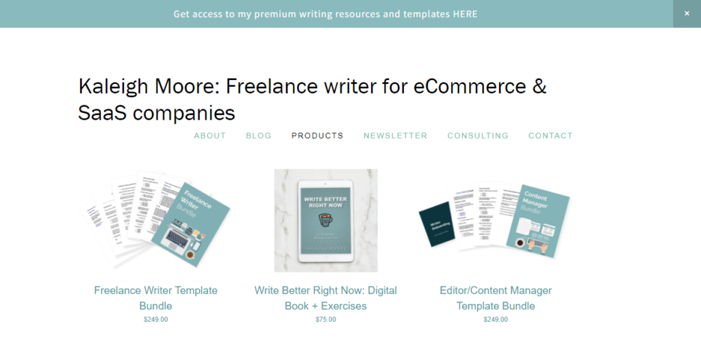If you’re looking for expert-backed freelance writing resources to create high-quality content for e-commerce and SaaS companies, check out Kaleigh’s e-books such as Write Better Now: Digital Book + Exercises, blogs, newsletters, and more. Kaleigh also offers resources and template bundles for editors and content managers.