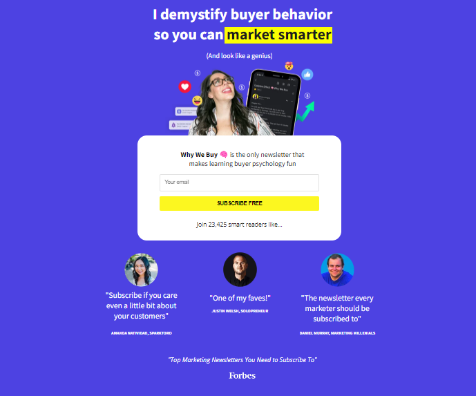 This weekly newsletter is curated by Katelyn Bourgoin and has over 23,425 subscribers. She refers to herself as “The Customer Whisperer” and aims at helping marketers dive into buyer psychology and behavior to understand why people buy. You can subscribe to this newsletter for free with your email.