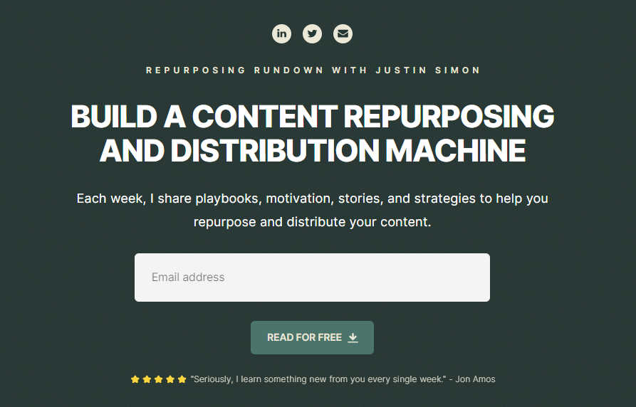 This is a weekly newsletter by Justin Simon, a content marketer, and advisor. With over 10+ years of experience in the content and marketing industry, Justin has curated an excellent newsletter that will give you insight into how you can repurpose and distribute your content to drive growth for your business. In the newsletter, you will find stories, playbooks, strategies, and more that will help you maximize results from old content.