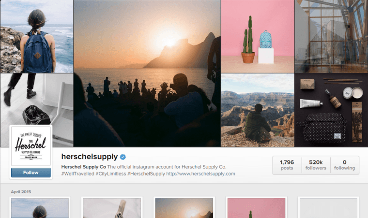 Herschel Supply’s visual marketing is focused on adventures. Take a look at the Instagram profile of the backpack shop to see magnificent photographs of mountaintop vistas and bustling metropolitan streets.