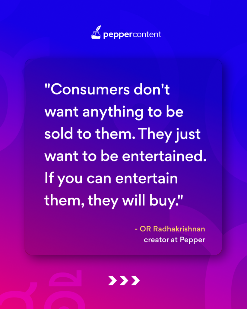 “When a consumer scrolls through his social media feed or watches TV, he is consuming content. He doesn’t want anything to be sold to him. He just wants to be entertained. If you can entertain him, he will buy. As simple as that”, Radha explains.