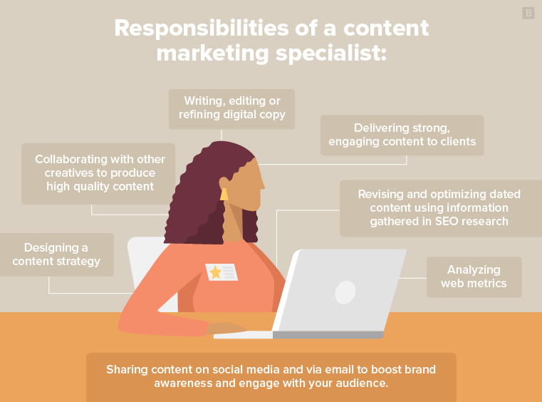 A content specialist creates content for various channels as determined by the marketing manager. As a result, their role involves research, analyzing content and consumer trends, developing content strategies, and finally creating content using this information.
