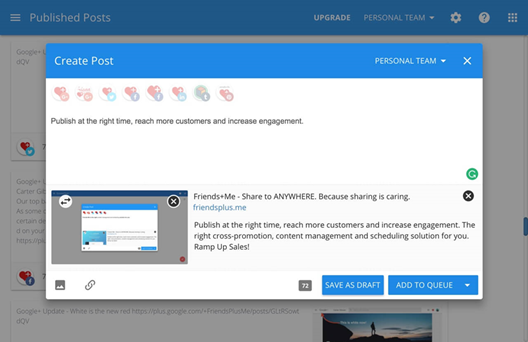 Exclusive value-addition by the tool: Friends+Me backs scheduling for Google+ profiles, communities, and G-Suite Google+. It is one of the best social marketing tools that enable you to plan and facilitate automation for reposting your Google+ posts onto your other social accounts.