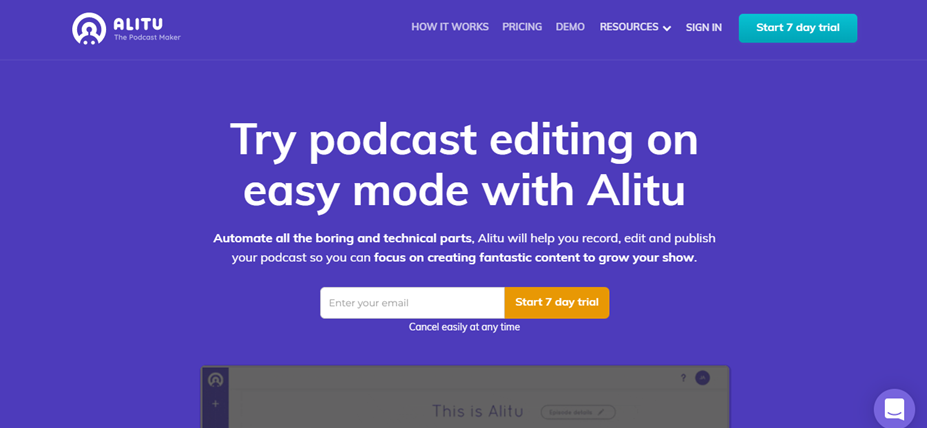 23. Alitu: A great tool known for its simplicity in editing. Alitu is a web-based tool and allows you to refine your audio with features like noise-reduction, compression, conversion of file formats, and audio leveling. It can mainly be used for five-minute snippets and is suitable for recording intros and outros.