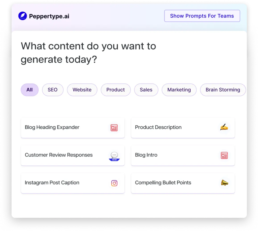 Peppertype.ai is one example of an AI tool for content. It is a content-generating AI tool that creates high-quality content in various formats, including blog posts, social media posts, and even product descriptions. Just choose the type of topic you need, insert your business details, and the tool will help you ideate, create, measure, and distribute your content and prove your content marketing ROI.