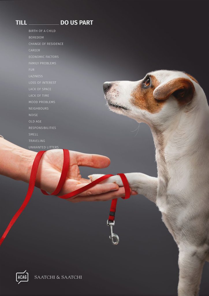 This was an eye-opener for many in Georgia where people would adopt pets and not treat them well. With people abandoning dogs, as the street dog population increased, there were quite some cases of dog bite accidents. This print ad by Saatchi & Saatchi, Georgia for the Association of Communication Agencies in Georgia was to tell owners to take matters seriously and think before adopting a pet.