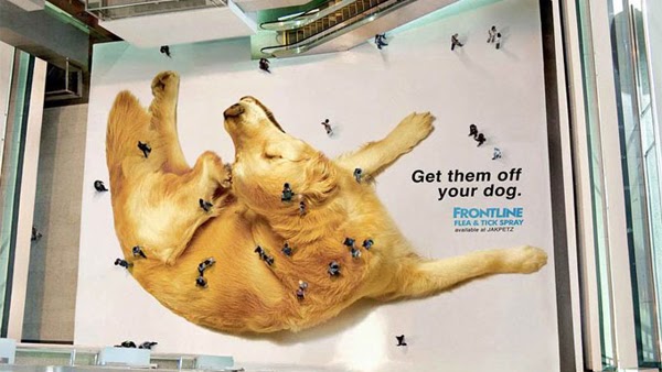 The Frontline floor sticker with ‘Get them off your dog’ promotes the need to protect your dogs. It is designed to be viewed from a high floor so people walking on the floor would look like fleas bugging the pet. How big would have been the poster of the dog, just imagine!
