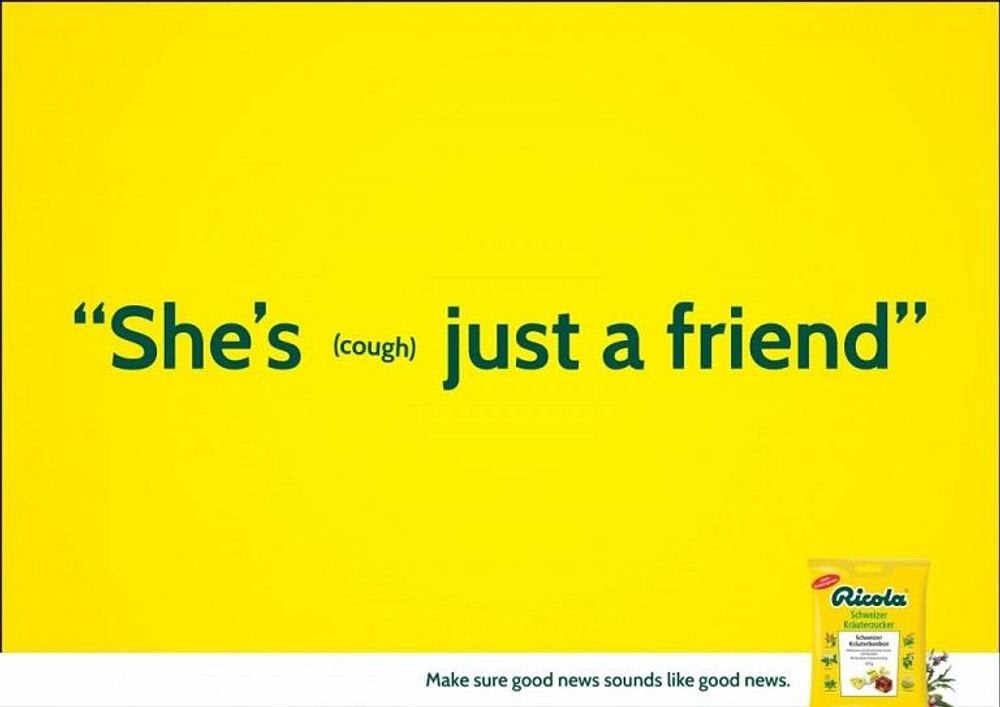 The funny ad for Ricola shows how easily the delivery of a message can be altered by just a cough. The brand had also made statements like “You look good,” “We’re having a baby,” all interrupted by coughs that changed the meaning, which should have otherwise sounded positive.