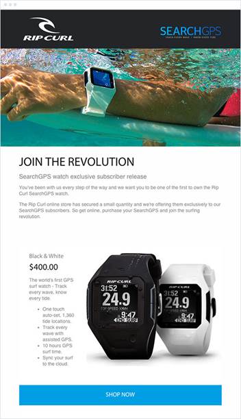 The tagline of Rip Curl’s email is quite simple: Join The Revolution. However, the tagline has a psychological impact on the reader.