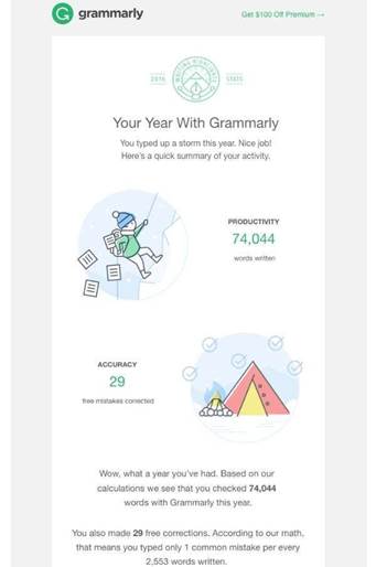 You can instantly see that the email does not include the reader’s name. However, it targets the reader’s information directly. Grammarly gives the reader their statistics. The email shows how many words they have written, how many corrections they did, and how many mistakes they made.