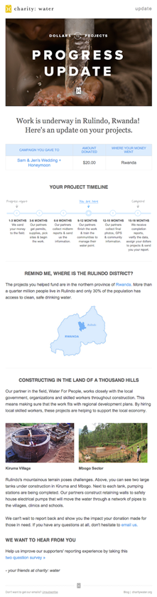 This is one of the longest email design showcases. However, it works to keep the audience engaged by showing the impact of the organization. Multiple elements hold the reader’s attention.