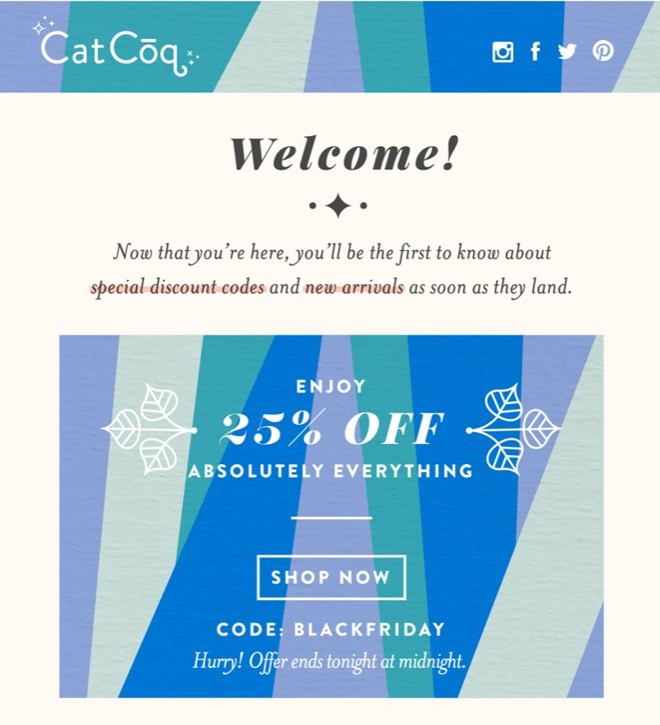 Promo codes are a great incentive driving people to make purchases at the spur of the moment. You can start including the promo codes well before the holiday season begins, and keep extending, or altering them throughout the season. Limiting promo codes to a specific email helps drive sales. You can also make promo codes a highlight of your holiday email marketing campaign, and offer them for a fixed period.