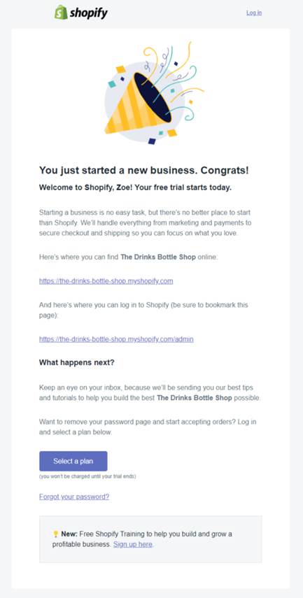 A free trial mail is sent to those who subscribe to a free trial from the brand. The welcome email can inform about the brand and also encourage the reader to avail of further paid services from the brand. This welcome email from Shopify is a perfect example.