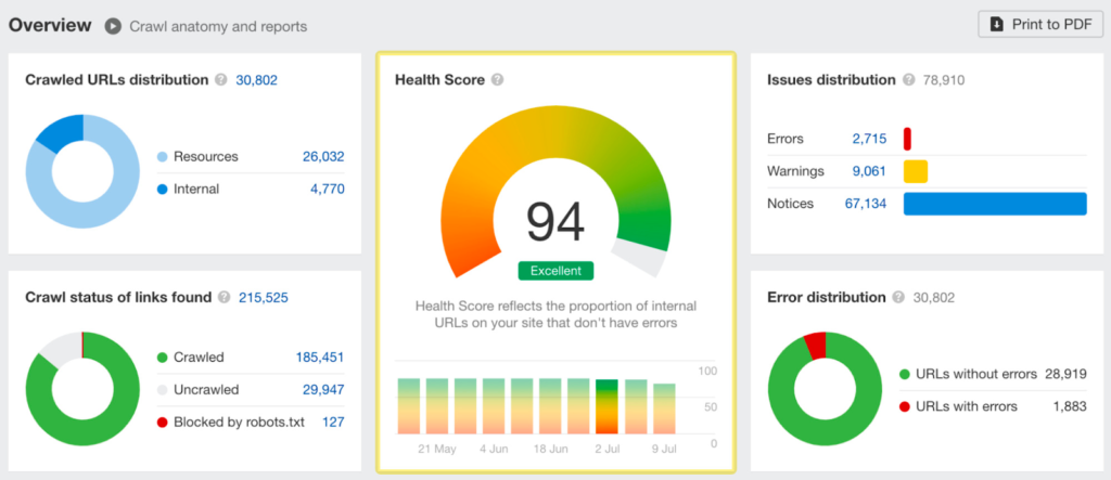 The website health score is a metric that indicates how well your website performs in terms of technical SEO, user experience, and other factors that impact its overall health. This metric is available in Ahref’s site audit, reflecting the proportion of internal URLs on your website that do not have technical SEO errors.