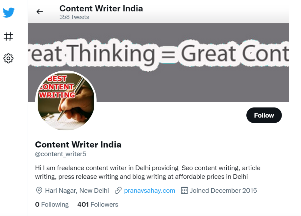 Try using relevant hashtags in your tweets such as #ThoughtOfTheDay, #ContentChronicles, #CreatorsLife #WritersForWriters, #WriteWing etc. Wisely, limit hashtags to a maximum of two to three per Tweet.