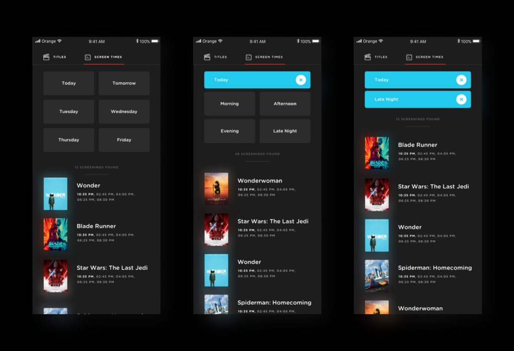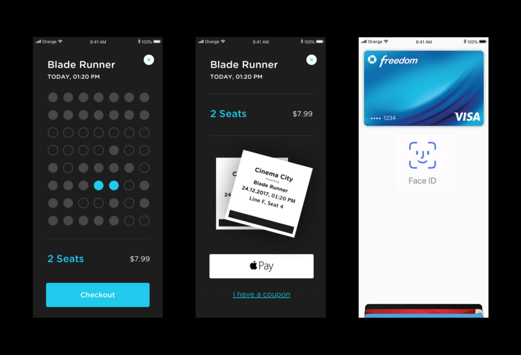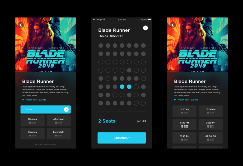 So, he decided to segregate the browsing functionality into ‘Search by Title’ and ‘Search by Time’ in his new UI design. That helped the interface become simple and easier to navigate. He further reduced the cognitive load by replacing the date pickers with large buttons displaying weekdays for the current week. He introduced morning, afternoon, evening, and late-night buttons under the ‘Search by Time’ category. Besides each screening tab, he added beautiful graded icons showing seat availability. Lastly, payment through Apple Pay or Google Pay was the icing on the cake.