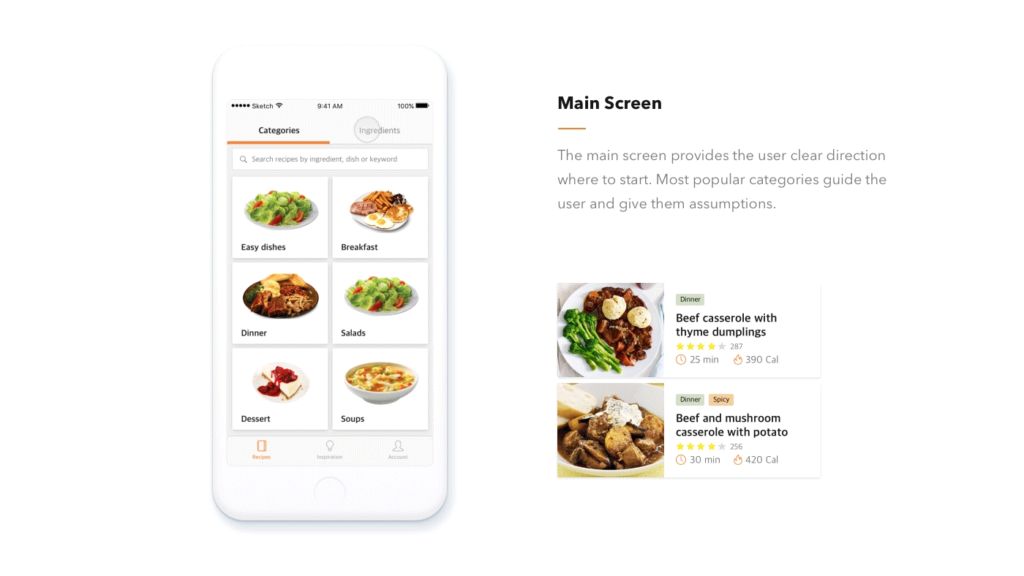 The Main Screen was designed with two visual columns: Categories (means breakfast, lunch, dinner, etc.) and Ingredients. It provided a clear direction to the user as to where and what to look for.
