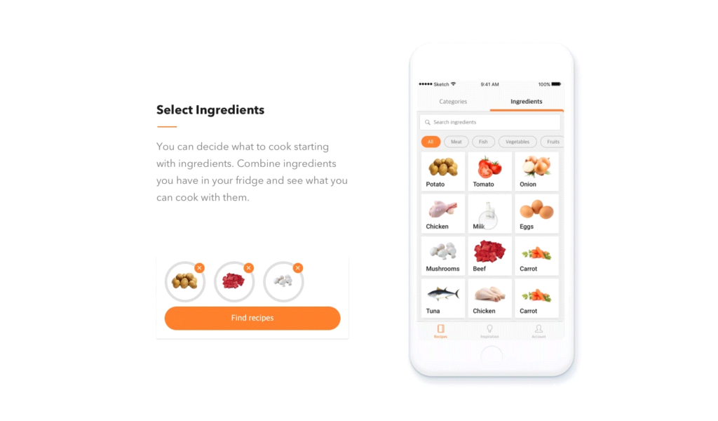 While having dinner with his wife, designer Vitaly Dulenko thought of creating an application that could advise him what to cook. He thought how amazing it would be if you’d pick ingredients from your refrigerator and get some recipes instantly. He wrote the user flow to add the following three crucial functionalities: