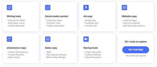 - These tools create ideas, topics, articles, blogs, posts, listicles, memes, captions, slogans, one-liners, etc.