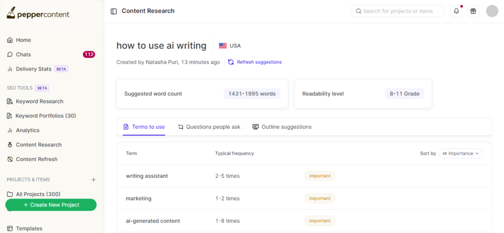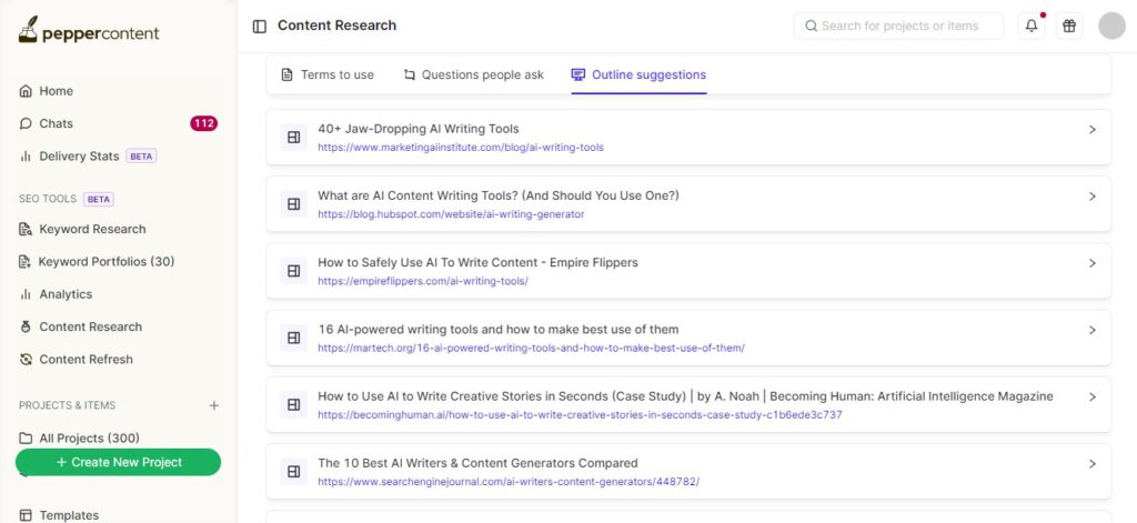 Pepper Platform offers Outline Suggestions to enable a streamlined content creation process.
