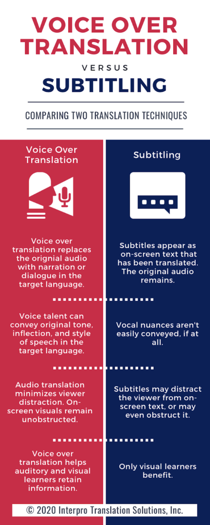 Voiceovers provide a way for a message to be conveyed in another language while retaining the original emotion and intent. If done well, voiceover translations can improve the quality of the video. It can help the brand reach a new audience and marketplace. They can be used with or without subtitles, but voiceovers are not without their challenges in both cases.