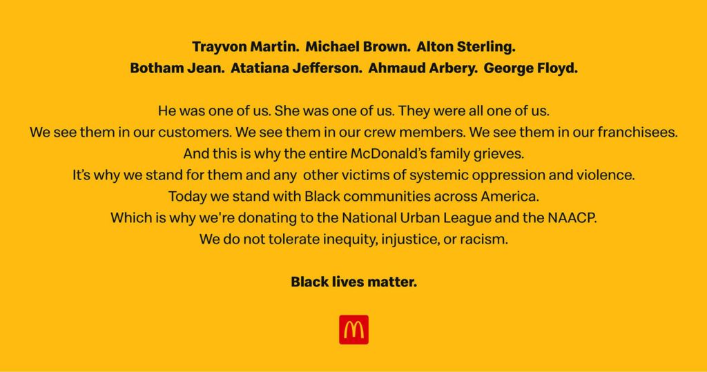 - #BlackLivesMatter campaign by McDonald’s when African-Americans are tortured in the United States.