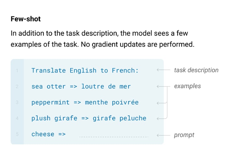 - Few-shot: This involves giving the model multiple demonstrations of how it could accomplish a particular task – training with multiple examples.