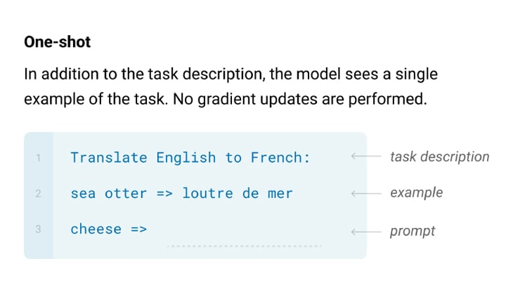 - One-shot: This involves training the model with just one example – a textual explanation of the task and a demonstration of its accomplishment.