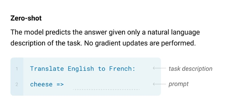 - Zero-shot: This involves training the model using only a natural language description of the task that needs to be accomplished.