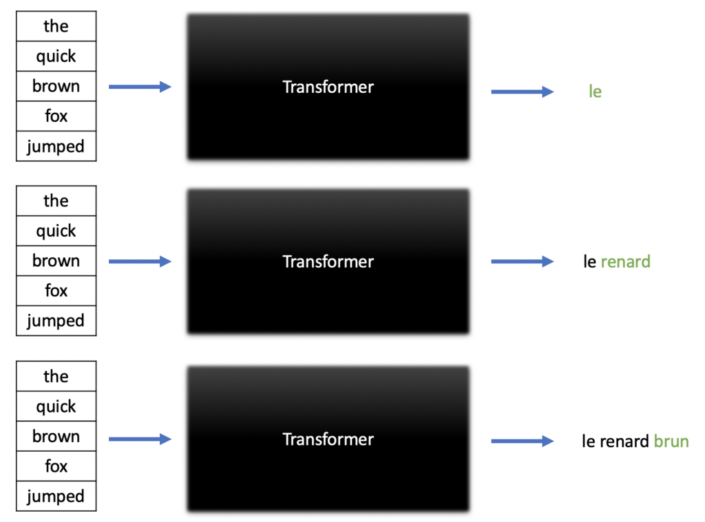 The model is designed to predict the next word in its assigned task iteratively. For example, the sentence, “The quick brown fox jumped,” needs to be translated from English to French, and people are using GPT-3 to do the same. The transformer model of GPT-3 will function as illustrated in the below image: