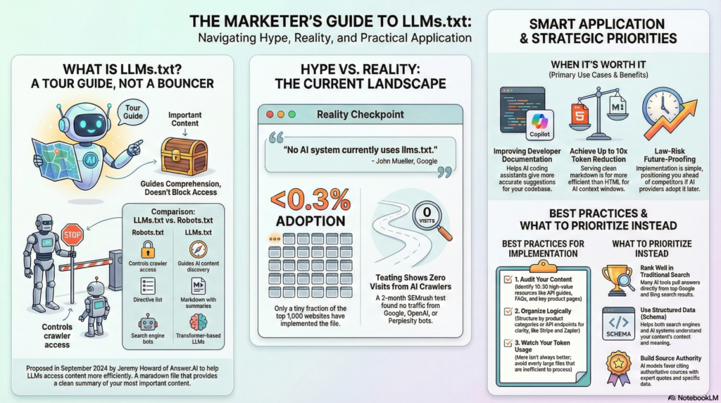 | Key Takeaways 1. Distinct Purpose: LLMs.txt guides AI models to valuable content using markdown, whereas robots.txt controls crawler access and indexing behavior. 2. Lack of Support: Major providers like Google have confirmed they do not currently use LLMs.txt, and independent tests show zero visits from AI crawlers. 3. Documentation Value: The standard is most effective for developer documentation, helping AI coding assistants provide accurate suggestions with high token efficiency. 4. Token Reduction: Serving markdown through LLMs.txt can reduce token usage by up to 10x compared to processing standard HTML pages with navigation and ads. 5. Strategic Focus: Marketers should prioritize proven tactics like structured data and source authority over this experimental standard to improve AI visibility. |