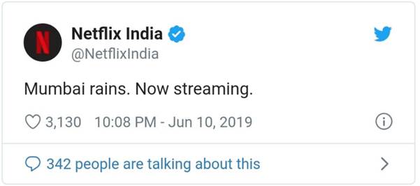 Netflix has constantly been keeping itself in tune with the marketing game. Apart from Instagram, Twitter is also one of the platforms where Netflix has a pretty active presence. Netflix’s tweets were viral during the Jal Lijiye meme, rains in Mumbai, the #Bindo trend that went viral, and many more incidents and topics. Netflix notably tweets regularly as a part of its social media marketing strategy. Their brand of moment marketing is what can be called stiletto sarcasm instead of bluntly criticizing things.