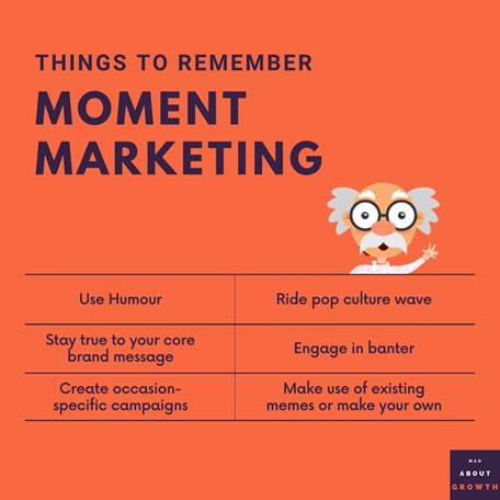 - It is also essential to keep in mind that you are aware of the legal and ethical implications of following a trend or molding it to create a moment marketing message. When you decide to craft a message or a campaign around a trend, read enough about a trend. Moment marketing, though time-bound, should still not be done in haste.