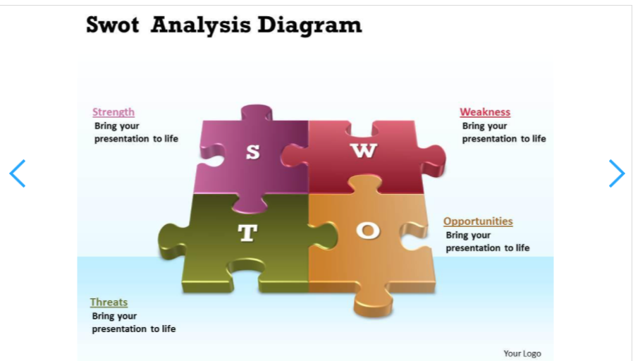 For example, if you are explaining SWOT Analysis in your presentation, it is always advisable to use pictures rather than going for textual representation in the form of bullet points. A plain-text reading of what SWOT stands for is not pleasing to the eye. It is also less impactful when compared to a pictorial representation.