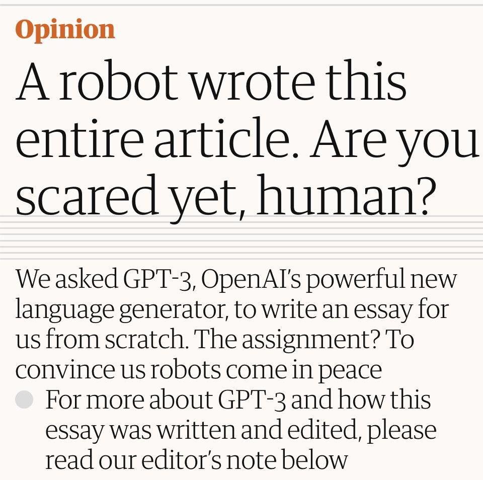 Someone (a human) at The Guardian came up with the idea of getting an article written by GPT-3; maybe another human came up with that sensational topic and the awe-inspiring intro. And then GPT-3 wrote the essay; editors edited that. And the final output triggered discussions across social media and helped news organizations generate a lot of impressions and ad revenue.
