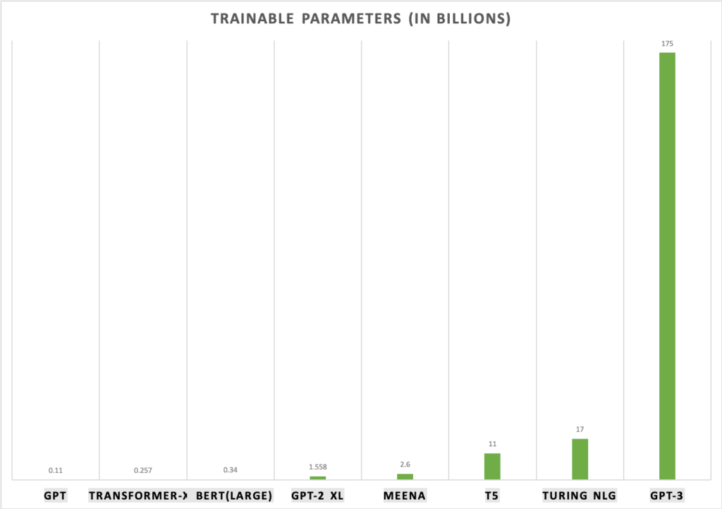 GPT-3 is not the first-of-its-kind; similar language models exist. Microsoft’s Turing NLG was the largest language model before the release of GPT-3. The capacity of these kinds of language models is defined in terms of “parameters.” Simply put, “more parameters” means more data has been used to train the model. The Turing NLG parameter capacity is 17 billion parameters, which is less than a tenth of GPT-3’s parameter capacity, which is 175 billion.